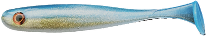 Dieser einem Hering / Weissfisch ähnelnden Köder verleiht der hellblaue mit leichten goldenden Glitzer versetzter Rücken, gepaart mit dem goldenen-transparenten Bauch einen sehr natürliches Dekor.